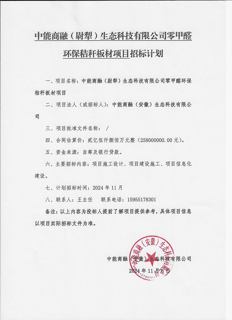 中能商融(尉犁)生态科技有限公司零甲醛环保秸秆板材项目招标计划